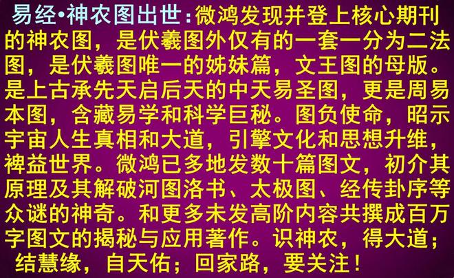 本文是微鸿的实事实录,涉及易学和宇宙精细结构常数137的一些发现,以及对这个常数的广视角科普。其中借由易经神农中天图发现的137算式,在数学上是一个美妙的成立的算式,眼见可证。另外有很多线索和信息指向它可能具有物理意义,不排除是精细结构常数137的答案,但这目前只是猜想,还在论证阶段,请理性看待。相关论文已在国际知名预印本开放科学OSF上预印发表,发表后迅速引起多领域专家的重视,在数学和自然科学领域已与相关专家展开交流讨论及合作研究,包括科学家对预印本中的137算式是否是精细结构常数的终极答案正在做进一步研究。易经神农中天图是新发现的一套太极生两仪“一分为二法”易图,是“一分为二法”伏羲图唯一的姊妹篇,已发表在核心期刊《中州学刊》,详情请参阅本账号主页文章栏中多篇文章的介绍。