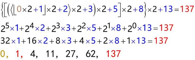 整个数列生成规律是:从第〇项的0开始,该项0乘以2,再加上斐波那契数列中的1,得到第一项1;然后把第一项1乘以2,再加上斐波那契数列中1后一项2,得到第二项4;接着再把第二项4乘以2,再加上斐波那契数列中2后一项3,得到第三项11;……反复如此,可构成无限长的数列。其规律可以直接从上述嵌套形式写法的137算式中看出来。