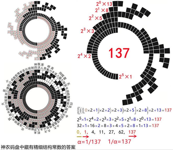 最后,让我们深信神农六十四卦圆图中蕴含的137算式是精细结构常数答案的最为神奇一点是,如上所述,科学家模拟估算宇宙大爆炸之初精细结构常数的值接近于1,之后及至今天,降到了1/137,从之初到今天,历经了137倍的衰变。而神农六十四卦圆图,总共六层(不计中心太极圆),是一层一层生成的,在生成第一层的时候,对应的结构体代表的数字是1,到六层时,变成了137,恰巧也经历了137倍的变化(预印本论文列出了代表这个过程的数列段:1,4,11,27,62,137),只不过它是增长。如果把它看成是分母的增长,或者逆向从外层向内层看,则也是衰变。