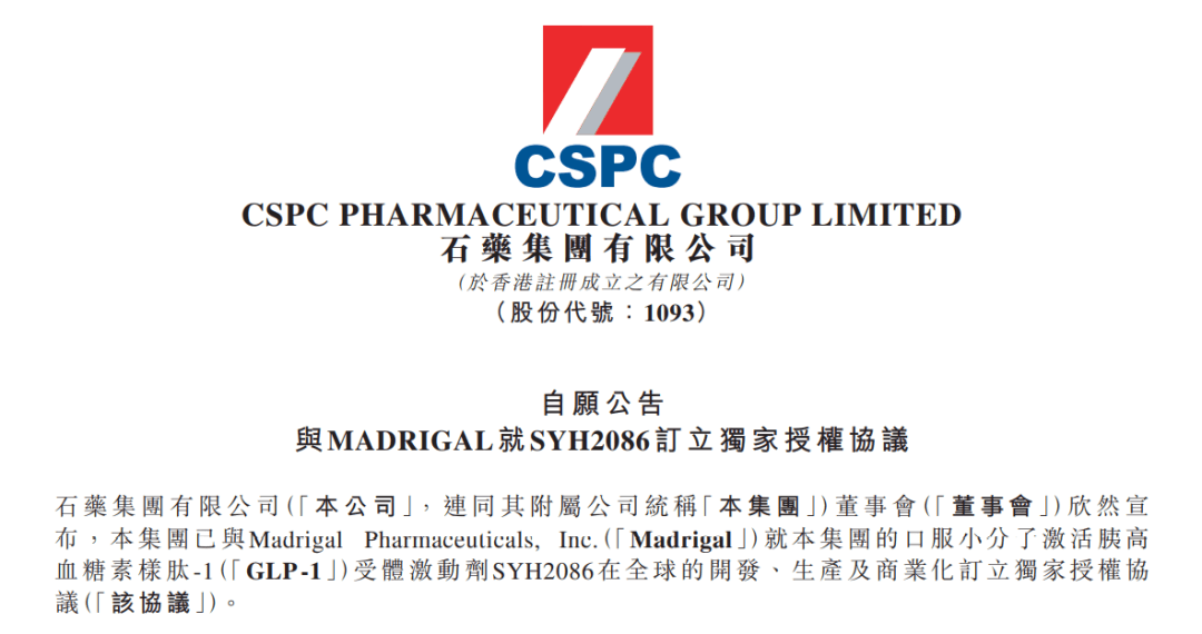 1. 石药集团官方公告石药集团与MADRIGAL就SYH2086订立独家授权协议